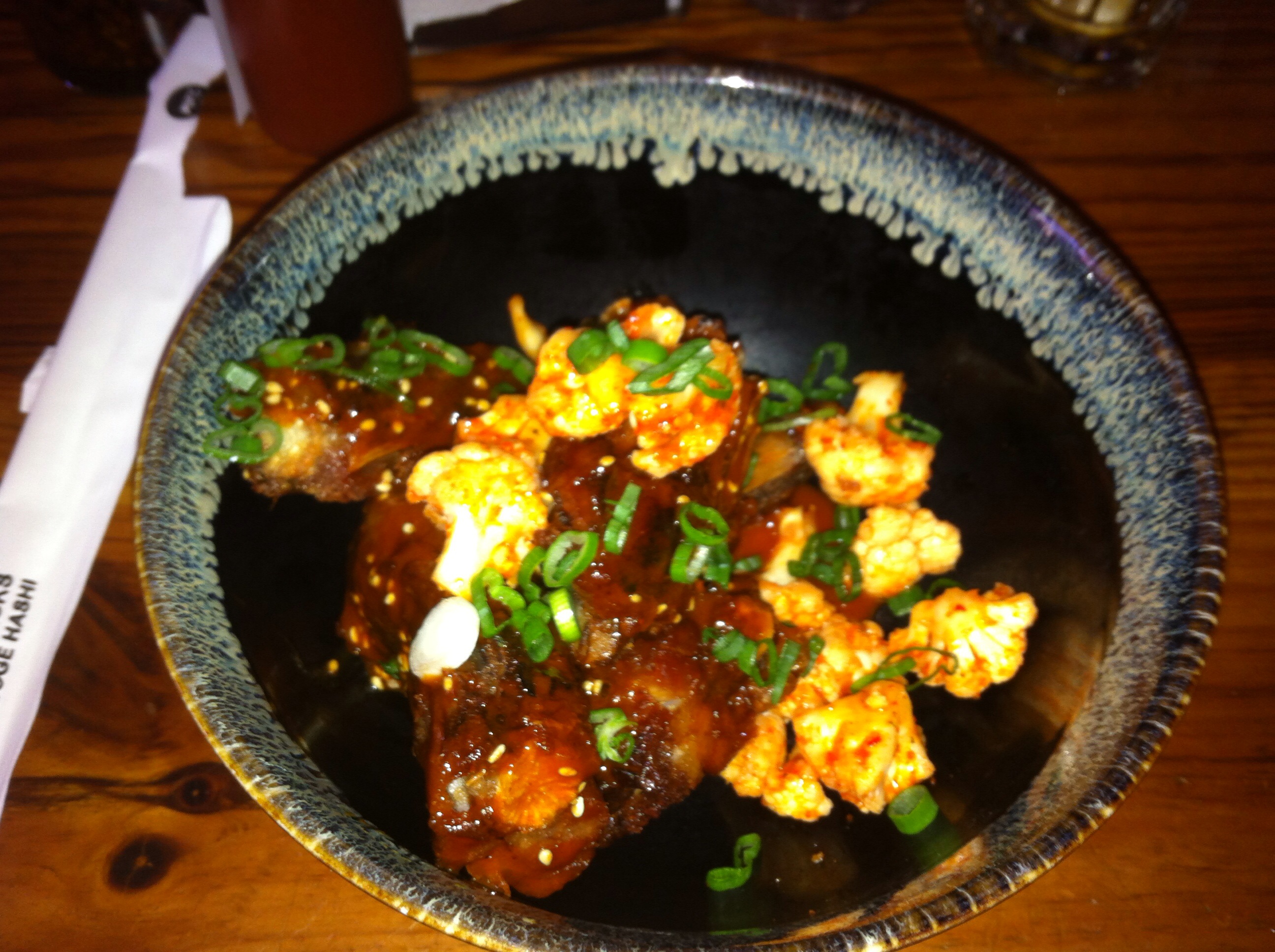 I drank the spicy bourbon cocktail the whole time I was at Cheu, I did this because I was sick, it does has a great selection of beers as well. The Spicy Bourbon is a mixture of 4 roses bourbon, ginger, green tea, cayenne, mint and lemon, this is basically the recipe that you would get if you asked your Italian, Asian, Irish grandmother from the south for a homemade remedy to cure a sore throat, not to mention it tastes delicious. To start the meal I ordered the BBQ pig tails, these are the perfect bar food, if you like wings and/or ribs you will love these. The BBQ sauce starts off with a sweet tang and ends with a nice spicy kick, the pig tails “chicken wing” texture allows you to enjoy the sauce thoroughly. The cauliflower kimchi that came with this dish was a nice ying to the yang of the spicy BBQ sauce.
