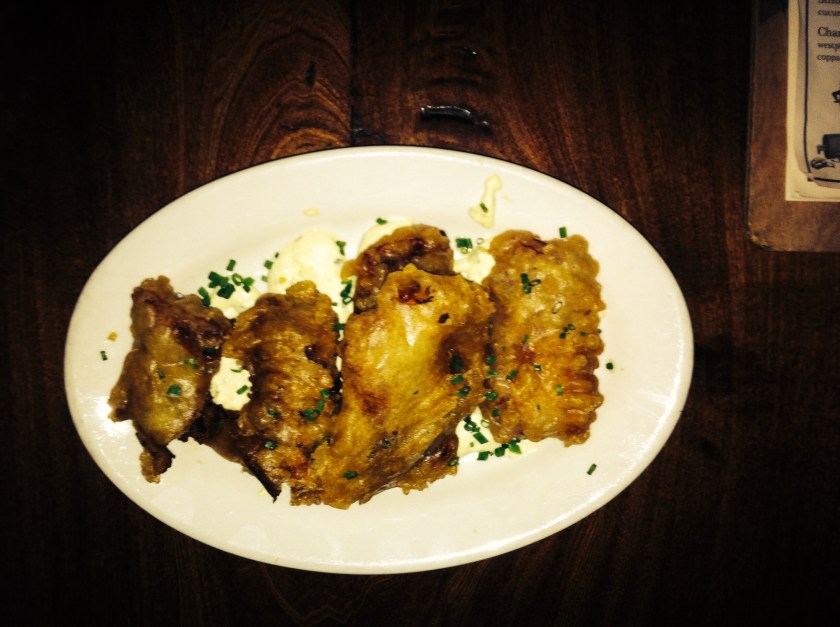 I drank the Staropramen Premium Lager the whole time I was at Bru. This is a Czech Pilsner that really is one of my go to beers when I know I am going to be drinking for a long time. I started the day with the fried pickles, these are fried in a beer batter with Westphalian ham and served on top of a mayo relish. If you like beer food, this is for you, greasy, tangy, salty, crunchy.
