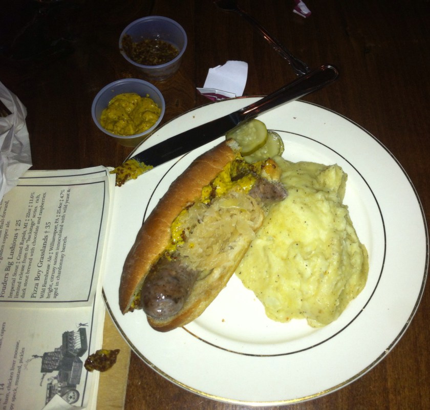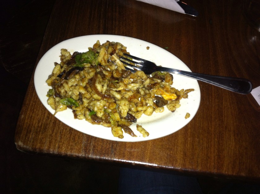 After a few more steins, I ordered the bratwurst and a side of the kase spatzel. Bru’s bratwurst is a classic version of the German wurst, it has a crisp skin with a juicy flavor. I loaded mine up with some spicy brown mustard and sauerkraut, which in my opinion is the best way to eat a bratwurst, but to each his own. The kase spatzel is glorious, it kind of reminds me of a German version of poutine. The spatzel, mushroom, onion, kale combination is delicious by itself, but once the muenster is added it becomes absolutely decadent, it is a dish you can’t stop eating and once you have to because there is no more, you think about ordering more. I finished the snow day with a nip of their cinnamon whiskey and headed home.