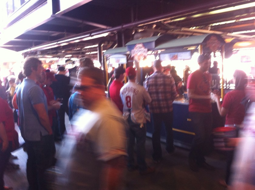 From John’s Roast Pork I headed to xfinity live and set up shop at PBR Bar and Grill. Here I did what you do at a bar before a Phillies game, I drank, I drank beer, whiskey and mixed drinks. The atmosphere at PBR is fantastic if you like sun and music, but I would advise against bringing your young daughters here. After PBR, we headed into the stadium, our seats were horrible, the Phillies were terrible but it was fun. I had some more drinks in the game and was going to get the schmitter but the line was too long for my taste.