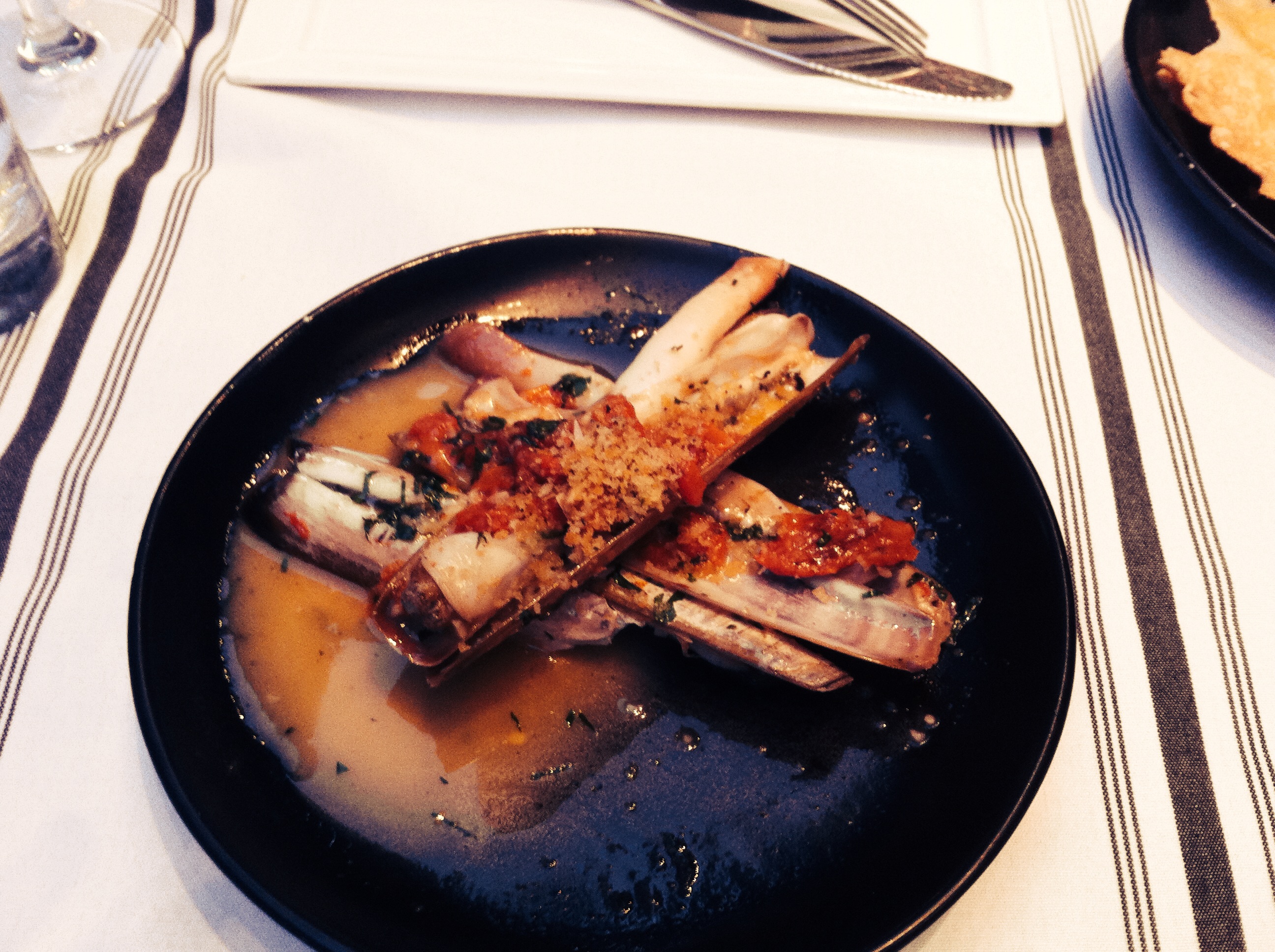 I started off the night with a refreshing Hell or High Watermelon from 21st Amendment. Even though I am not a huge wheat beer fan, on a warm night this beer is a great way to kick back and relax. For the rest of the night my friend and I downed a couple of bottles of the Klima Red. This wine is from the island of Crete and is a succulent berry flavored dry wine that I found to go down my gullet nice and smooth. To start off the night food wise we ordered off the small plates menu, we ordered the solines which is a dish of razor clams, with white wine and olive oil breadcrumbs. The razor clams with the white wine was perfect, the clams had a fresh sea taste while the white wine added a zestiness to the dish, unfortunately the olive oil breadcrumbs were not my favorite part of the dish, they did not ruin it but in my opinion it would be better without that addition. Up next came the smelts, flash fried with a side of grilled lemon. If you have ever had smelts these are a terrific version. These smelts are salty, crunchy with a fish yet mild flavor that goes seamlessly with a punch of the squeezed grilled lemon at the end. Smelts are such a simple dish, yet so delicious when done correctly. Next out came the stuffed cubanelle pepper with kefalograveria cheese and long hot relish. This dish was outstanding, the cubanelle pepper was cooked to leave a nice char on the outside but just right on the inside filled with the wonderfully delicious salty kefalograveria cheese (similar to a Pecorino-Romano style) that complimented the pepper without totally overwhelming the taste and the long hot relish at the end of the array of flavors that added a delicate kick to the end of this delicious dish.