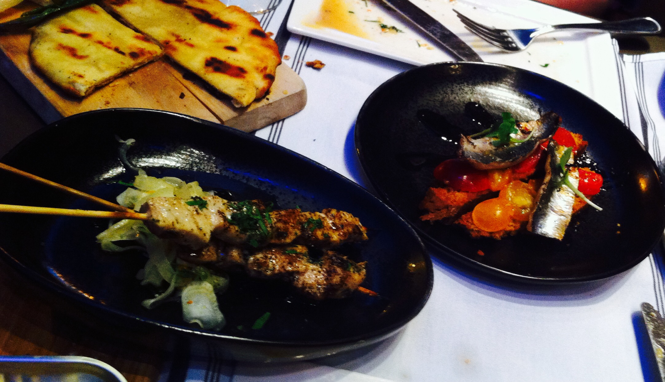 After the small plates we decided to order the Melitzanosalata which is a charred eggplant spread, the marinated sardine and heirloom tomato on barley toast and the swordfish souvlakia over fennel salad from the grill. I was not a huge fan of the bland charred eggplant spread, but the pita I spread it on was delicious. The marinated sardine and heirloom tomato on barley toast was a hit for my tastebuds, the saltiness of the sardines matched with the sweetness and freshness of the tomato reminded me of my youth when I would eat whole fresh tomatoes with just a little salt on each bite. I would rather have had the dish come on sourdough toast then the barley but it served as a solid substitute. My favorite dish of the night came next, it was the swordfish souvlakia. This was most likely the simplest and as usual that usually means the best, the Greek seasonings of oregano and lemon blended perfectly with the char of grilled swordfish and the refreshing fennel salad. Eating this dish on a kabob allowed me to close my eyes and pretend for just a second that I was sitting on a street in Greece enjoying some of their delicious street food.