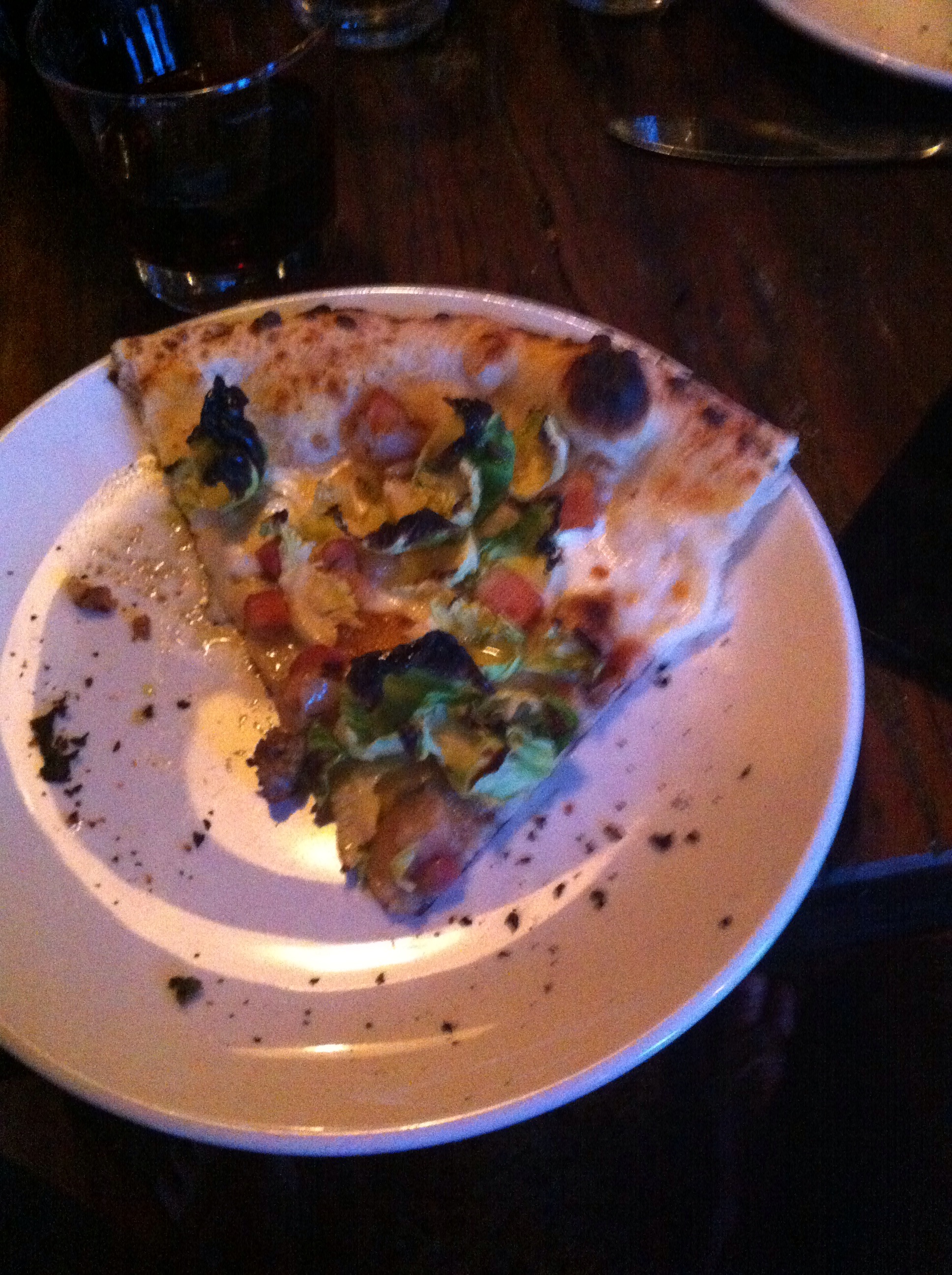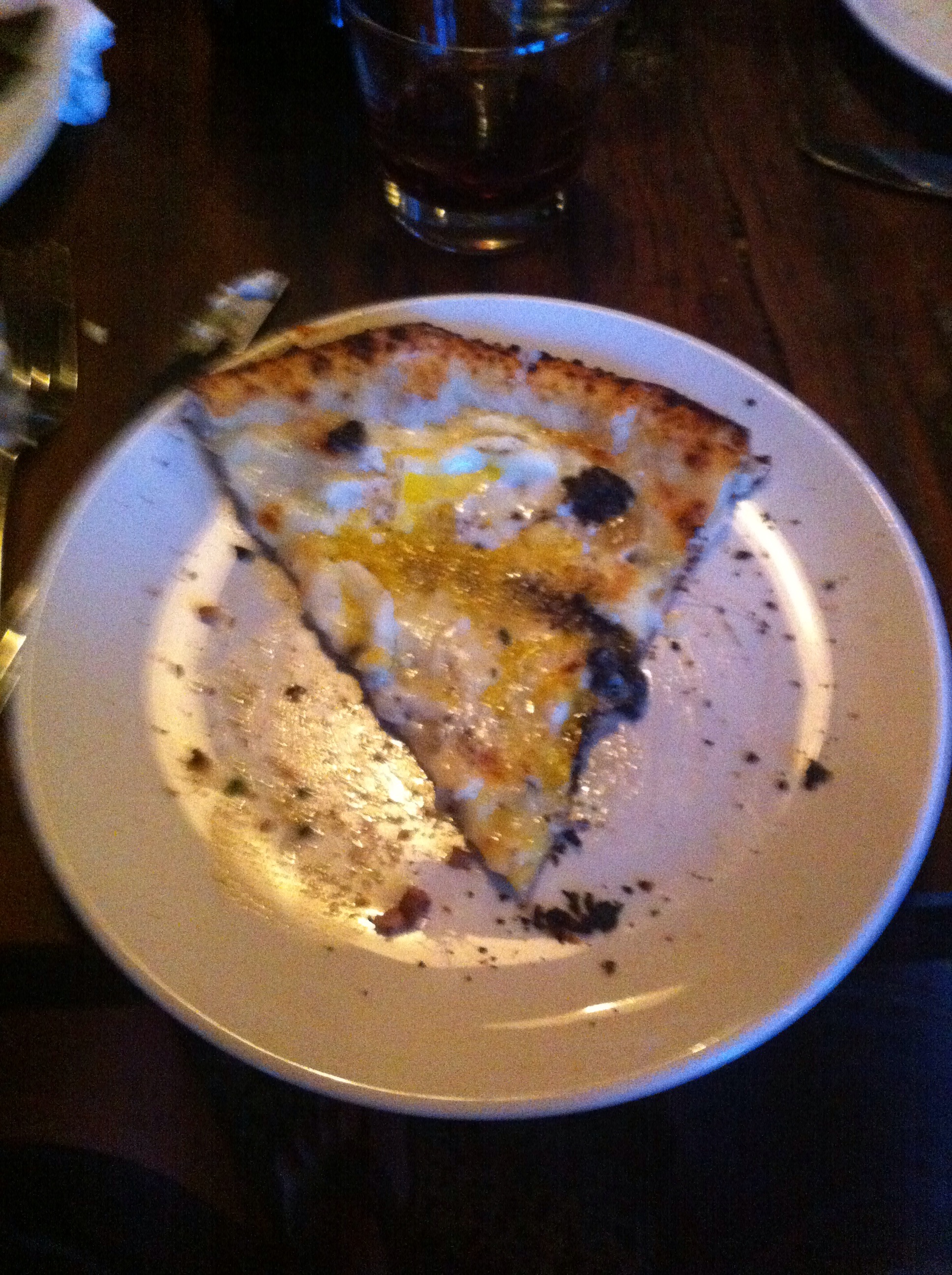 Later that night a group of us went to dinner at Stella. The atmosphere at Stella is always fun, so it is always a great place to have dinner with a large group. I ordered a bottle of Pinot noir that served as a great pallet cleanser for the night. For an appetizer we ordered the sheep’s milk ricotta with rosemary and flatbread. The sheep’s milk ricotta was a great way to start dinner, rich, yet light with a creamy texture. For dinner we ordered 6 pizzas, a margherita, piccante, nduja, brussel sprouts, pistachio and a tartufo. All of these pizzas came on a magnificently cooked wood-oven grilled crust. The crust here is some of the best in the city. My three favorites were the margherita, piccante and tartufo. The others were also delicious, so it really depends on what you are in the mood for that night. The margherita came with San Marzano tomatoes, basil and buffalo mozzarella, margherita pizza is so simple yet so hard to perfect and this was great. The sweet tomatoes were complimented nicely by the fresh basil and creamy mozzarella. Up next came the piccante, which came with crunchy spicy capicola, crushed red pepper, aged provolone and tomato. The spicy capicola became even spicer with the addition of the crushed red, while the strong taste of the provolone and sweet tomatoes balanced out this pizzas tremendous flavor. The final piece I tried for the night was the tartufo, that came with black truffle, egg and fontina cheese. The nuttiness of the black truffle with the runny egg yolk made this pizza very rich, but I was in the mood for rich so I did not mind one bit, I remember my eyes almost going into the back of my head with excitement when I ate this dish, it was beautiful.