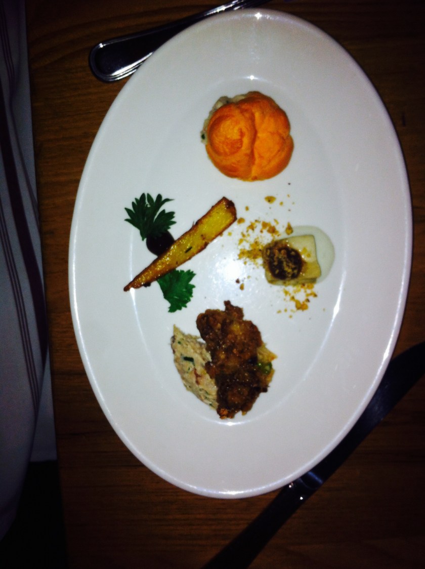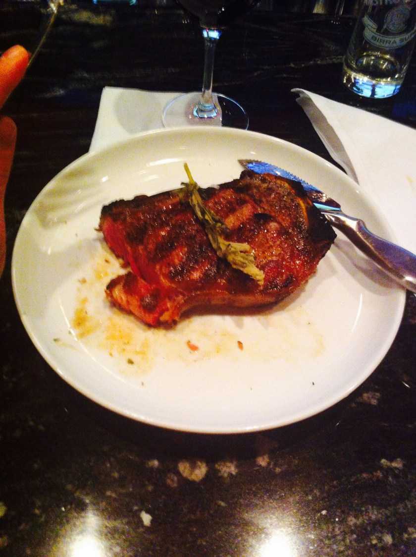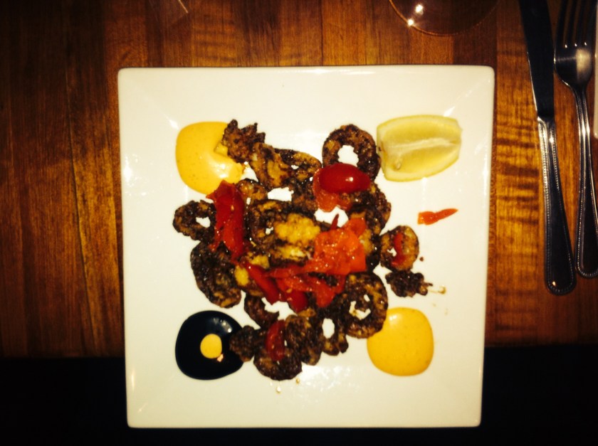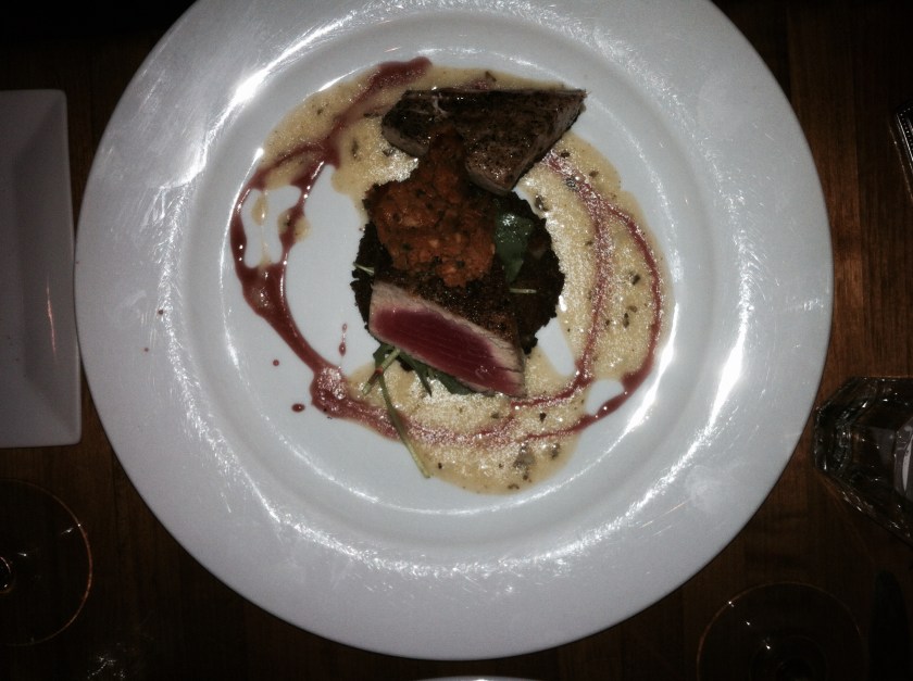 I brought a bottle of red wine for dinner, whatever your drink of choice is will work great at Entree. I started off with the fried calamari tossed with peppadews and a balsamic vingarette reduction with a side of Sriracha aioli. This was hands down the best fried calamari I ever had, it was perfectly fried so that there was a crunchy breading that was not too greasy, while the peppadew and balsamic vingarette added a sweet refreshing pop to the calamari and if you like spicy the Srirachi aioli really adds a perfect kick to the end of this flavorful dish. My friend ordered the wedge salad that included grapes, cherry tomatoes, glazed walnuts, crispy prosciutto and Gorgonzola dressing. As a person who normally does not like Gorgonzola dressing, I can tell you this was really a delicious dish. The refreshing wedge of lettuce with sweet grapes and the salty prosciutto made this salad a perfect dish to start the night. This is one of those salads that you could eat as your main dish if it was bigger.